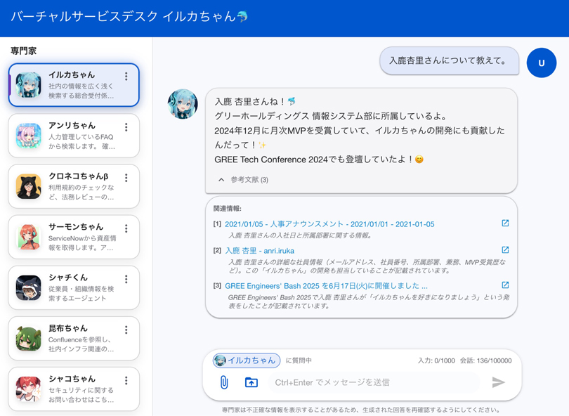 藤咲:それに加えて、情シスにはもともと有人のサービスデスクがあったり、社内に申請システムが複数あったりと、問い合わせ窓口が煩雑化していました。それらをまとめ、調べものの第一歩として「イルカちゃん」というAIエージェントを動かすことで、問い合わせ対応を効率化しようという構想から生まれたのが「バーチャルサービスデスク」です。