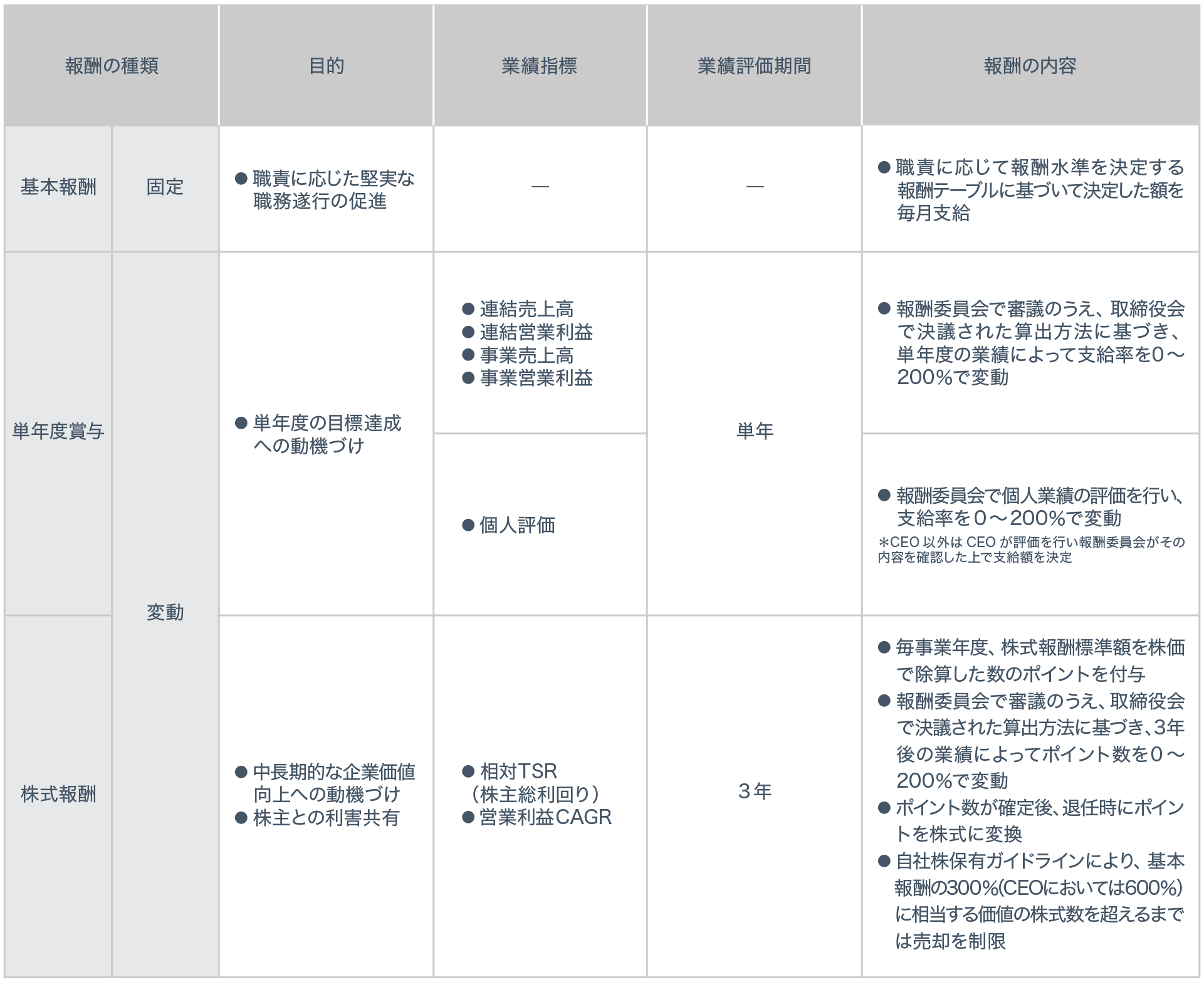 - 職責に応じた額を基準額とし、0~200%の変動幅の範囲内で、全社業績(連結売上高・連結営利業利益)、事業業績(事業売上高・事業営業利益)、個人業績評価の数値及び構成割合に基づく算定式に従って支給額を決定し、当該事業年度に係る定時株主総会後の一定の時期に支給します。