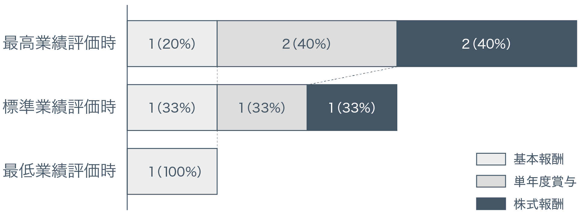 - 業績向上を動機づけるため、業績連動性の高い報酬構成とする
