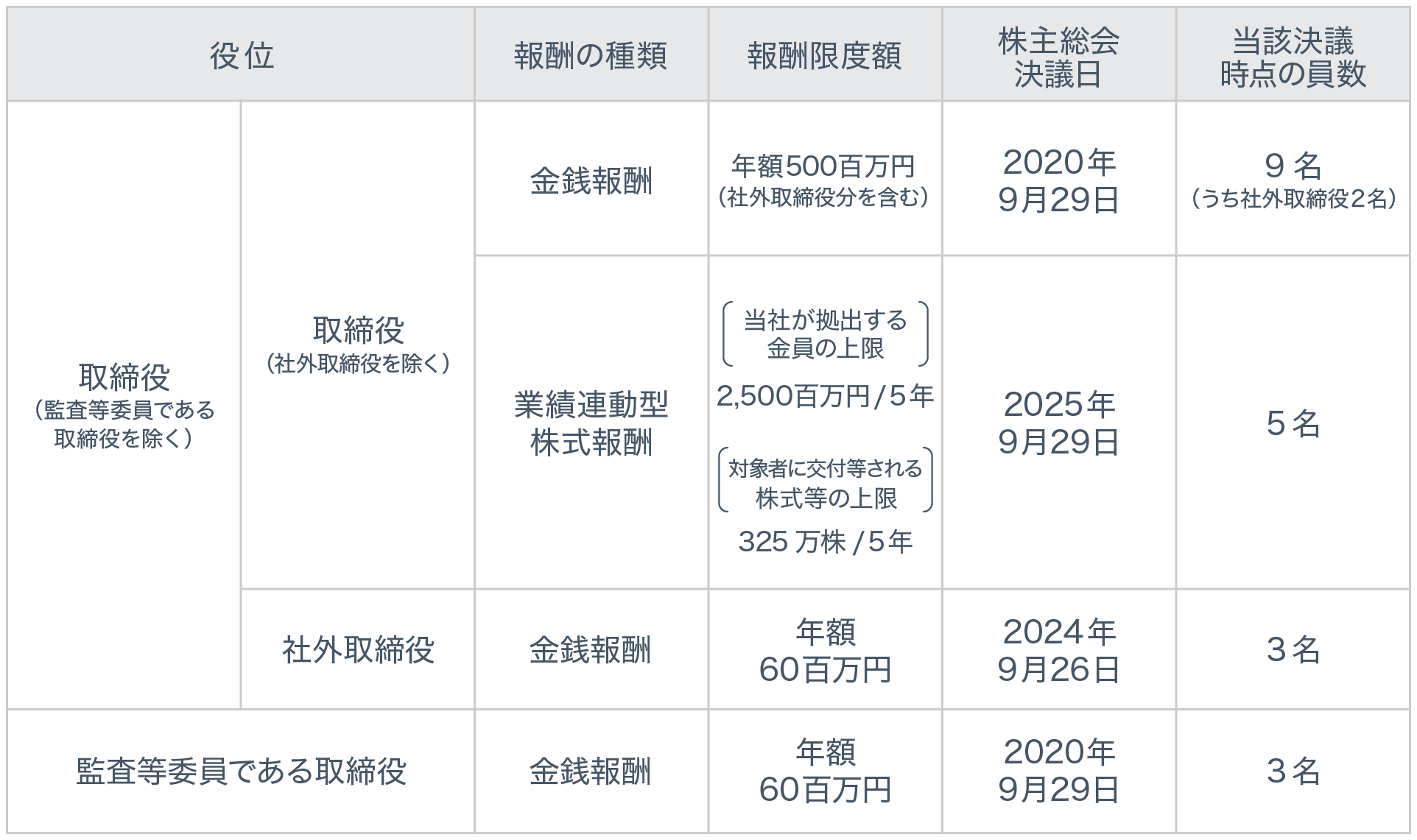 当社は、2025 年8月21日開催の取締役会において、当社の取締役(社外取締役、監査等委員である取締役及び国内非居住者を除く。以下同じ)を対象とした報酬制度及び個別報酬を改定することを決議し、2025年度定時株主総会にて、取締役等に対する株式報酬等の内容の一部改定を決議しました。 本制度は、中長期的な業績拡大及び企業価値の向上を目指すにあたり、対象取締役等が株価上昇によるメリットのみならず、株価下落によるリスクまでも株主と共有することで、意欲及び士気をより一層向上させ当社の結束力及び将来的な時価総額向上へのインセンティブをより高めることを目的とし設計しております。