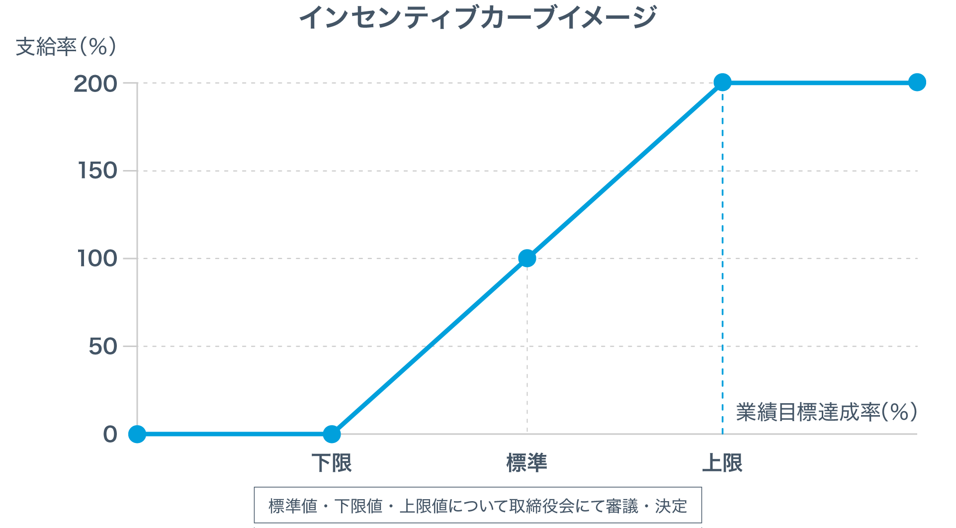 - 標準業績評価時に 100%、最高業績評価時に 200%、最低業績評価時に0%の支給率となるように、各評価指標に関し、インセンティブカーブを設計しております。(単年度賞与と同様)