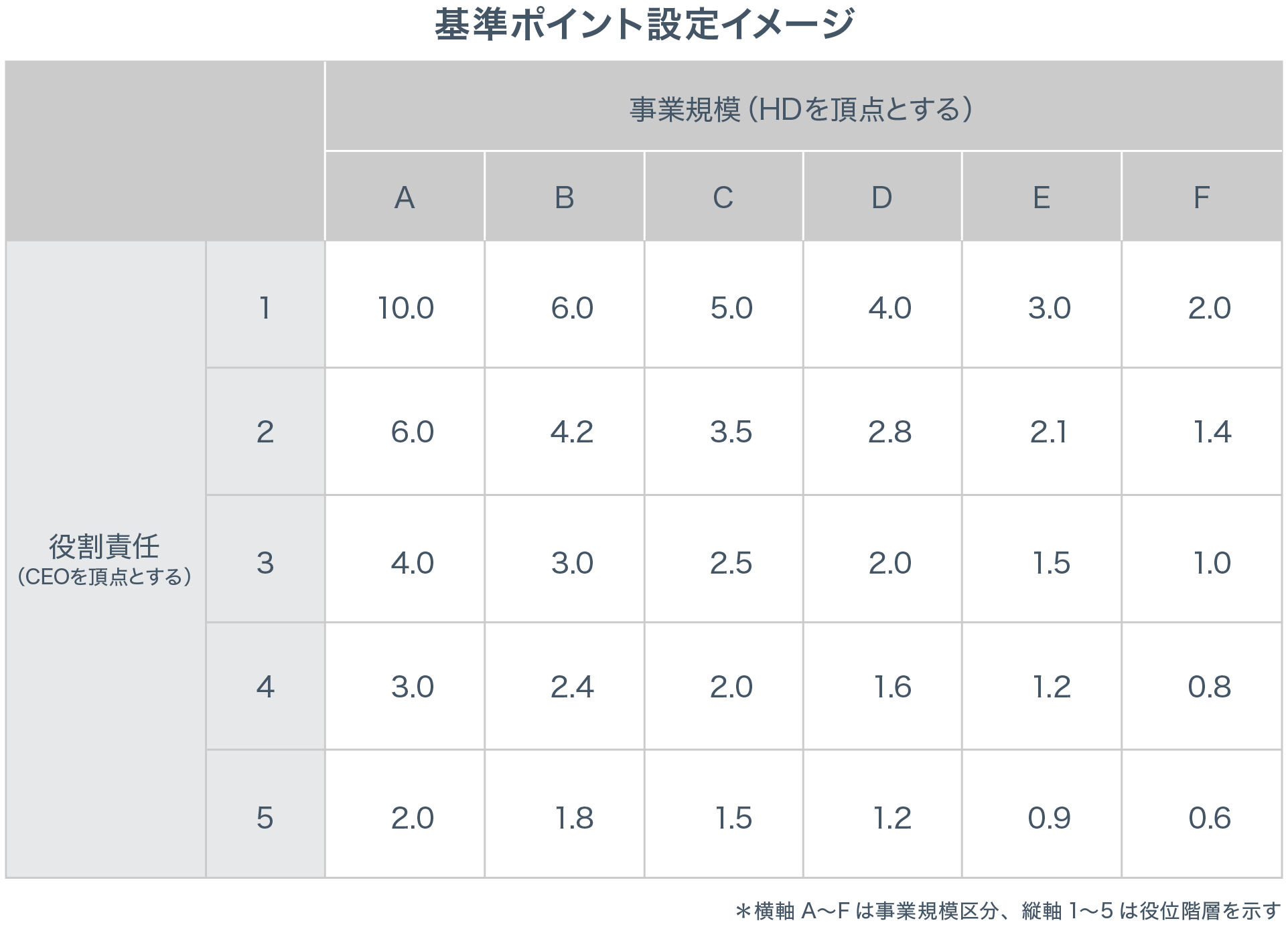 - 基準ポイントの数は HD 内の事業規模および役位に応じて設定されます。 なお、使用人兼務の取締役に関しても、同様に適用しております。