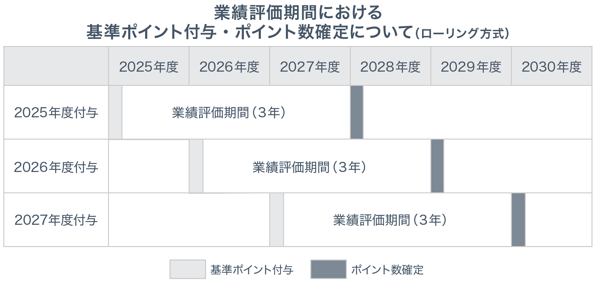 - 就任中の事業年度に関して、当該事業年度の一定の日(以下「ポイント付与日」)に、基準ポイント(職責に応じて設定される基準額のうち、業績連動株式報酬の基準額÷当該事業年度の所定の日の株価)の付与を受けるとともに、ポイント付与日が属する当該事業年度を初事業年度として連続する3事業年度(以下「業績評価期間」)が経過した後の一定の日をもって、本制度のために設定された信託(以下「本信託」)から当社株式等の給付を受ける権利を取得することができます。